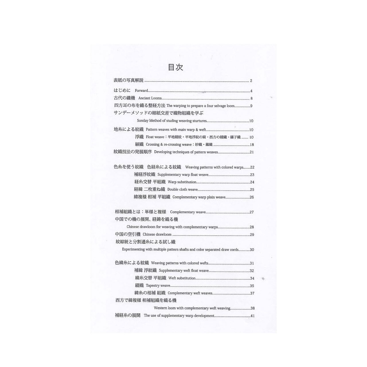 本書では、地糸である経糸と緯糸の交差による綾織や捩織のような紋織から、経錦や緯錦などの多色による紋織物まで、どのような順序で織り手が機上で考えついてきたのか、機の構造と共に解説する。